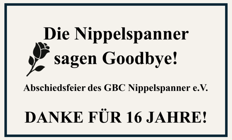 Kommt vorbei und verbringt mit uns einen gemütlichen, vielleicht etwas wehmütigen, aber vor allem herzlichen Vormittag. Lasst uns diese Zeit nutzen, um den GBC Nippelspanner e. V. gebührend zu verabschieden.